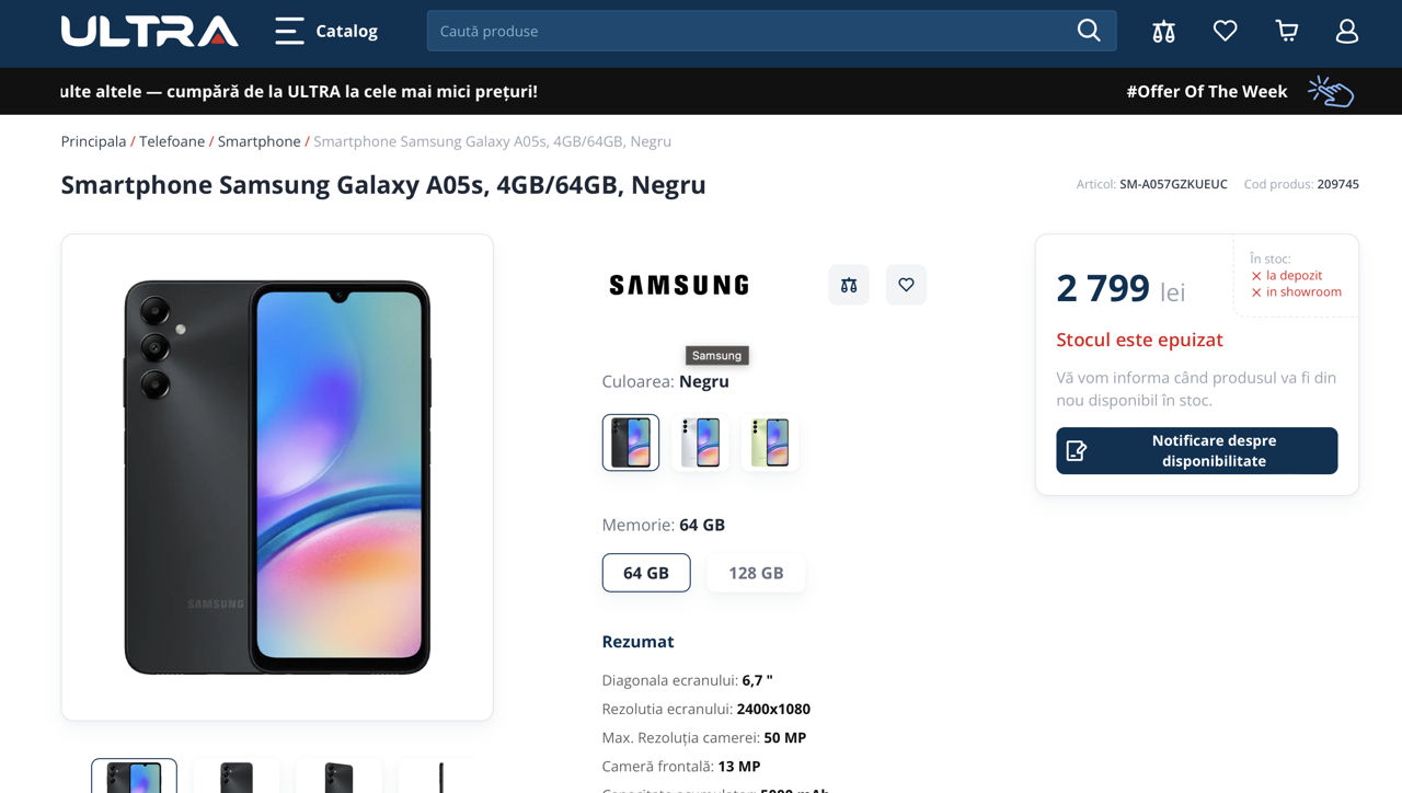 Elegant și modern, Samsung Galaxy A05s cu un ecran mare de 6.7 inch FHD+ (rezoluție 1080 x 2400 pixeli) și culori vibrante – alegerea perfectă pentru muncă, studii și divertisment. Bateria puternică de 5000 mAh cu încărcare rapidă asigură o autonomie îndelungată. Camera principală de 50 MP oferă fotografii și videoclipuri clare, iar camera frontală de 13 MP este ideală pentru selfie-uri și apeluri video.