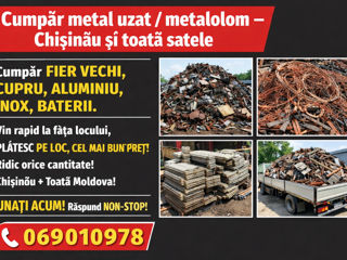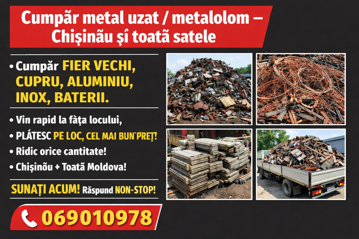 Cumpăr metal uzat / metalolom. Accept: fier vechi, cupru, aluminiu, inox, baterii. Vin la fața locului, preluare rapidă. Plata pe loc, preț corect. Sună oricând.