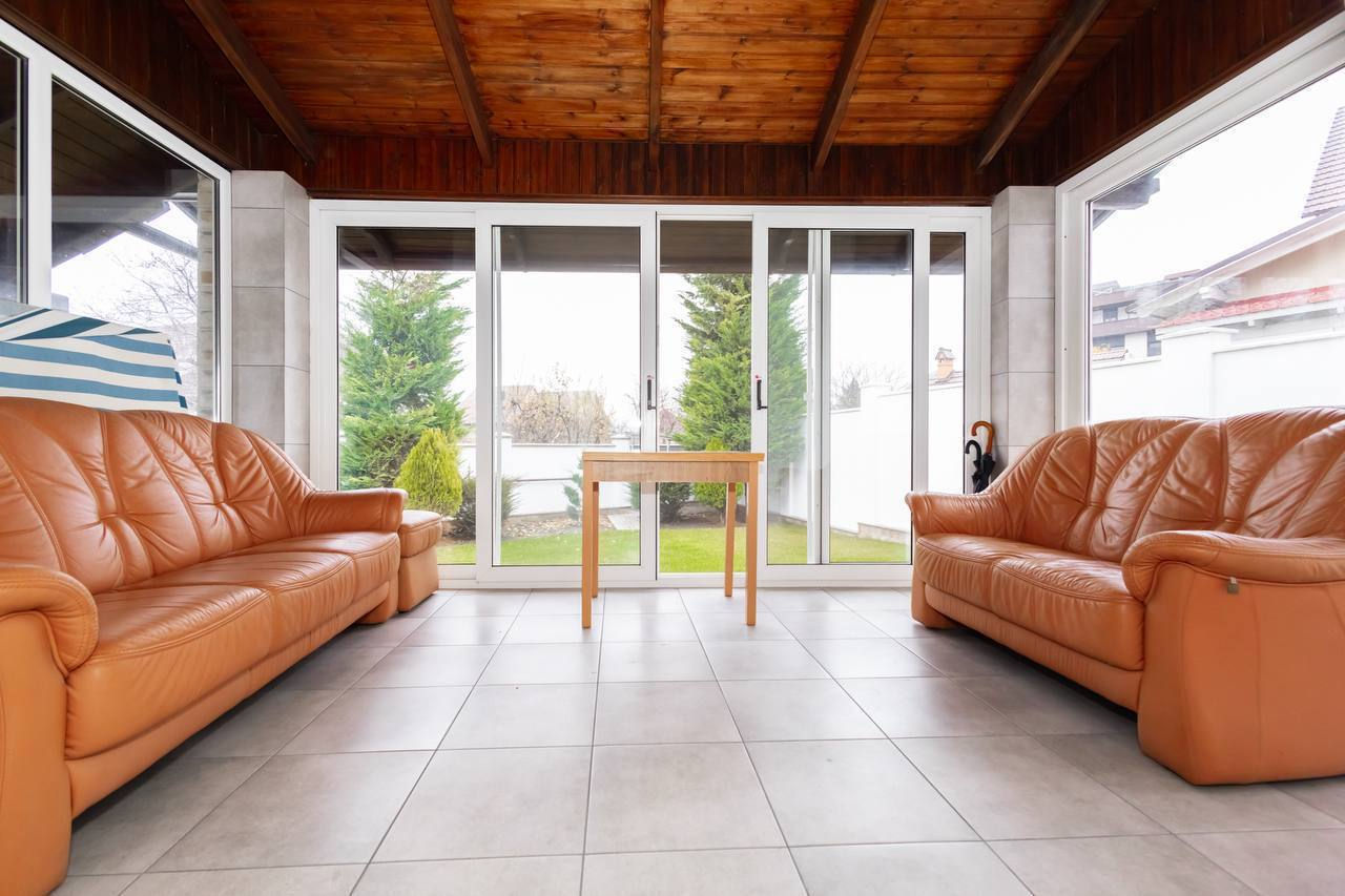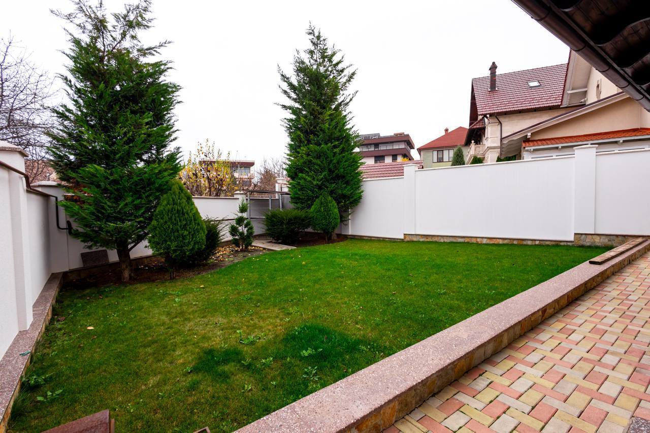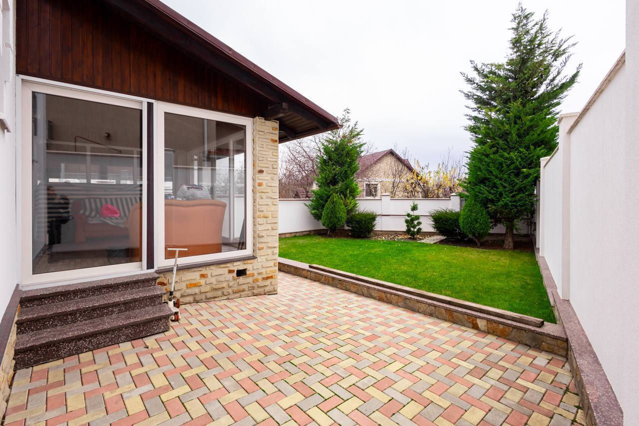 Terasă, curte cu pavaj și gazon