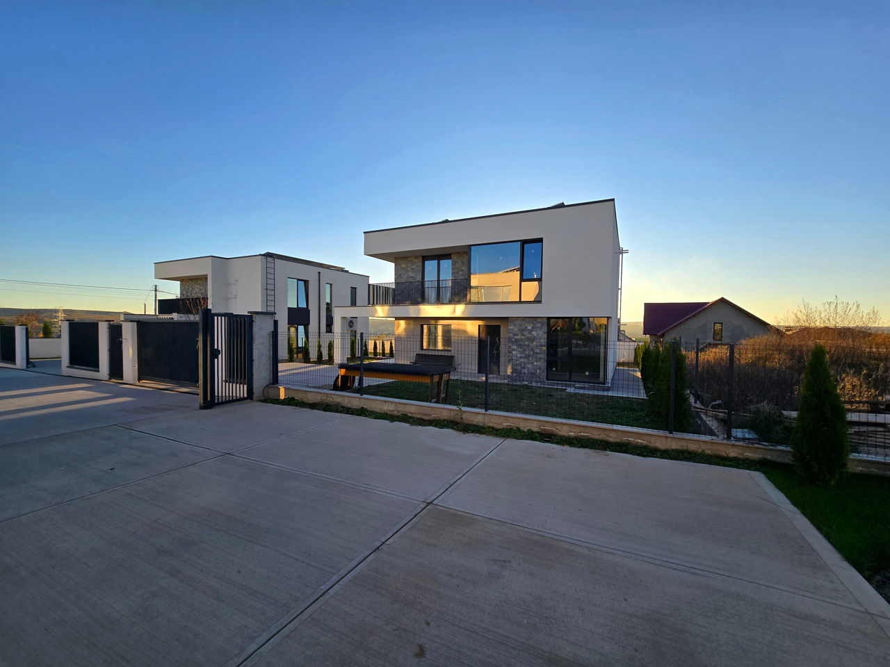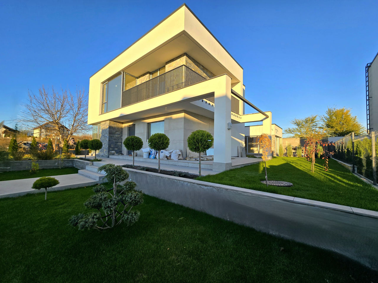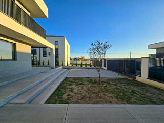 Se vinde cu curte amenajată, sistemă de irigaţie, gazon.