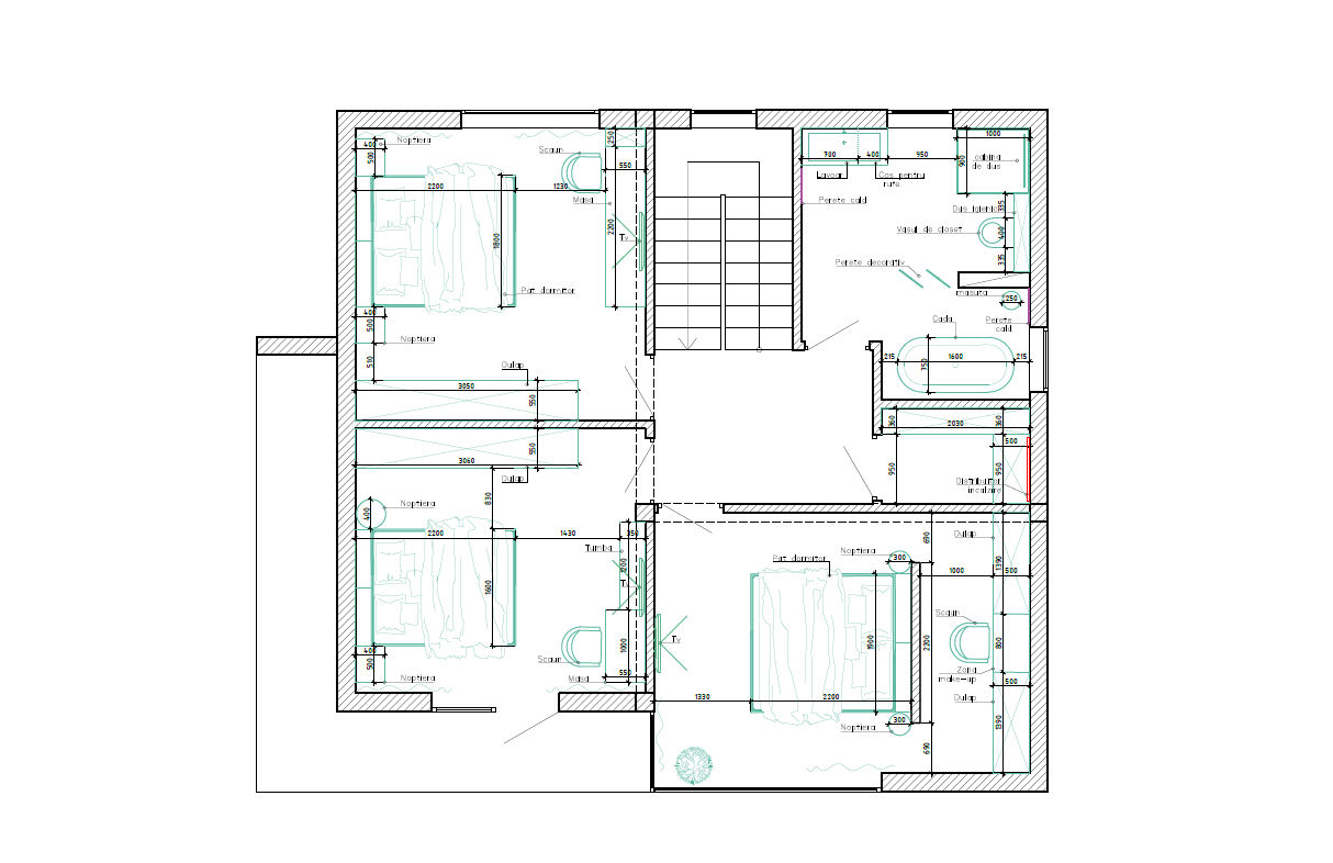 Nivel 2: hol, 3 dormitoare, bloc sanitar, terasă.
