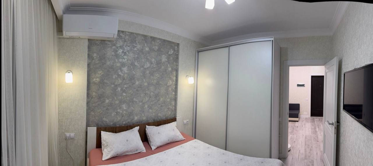 Квартира меблирована, со всей необходимой бытовой техникой. Она состоит из гостиной, кухни, ванной комнаты, спальни и балкона с панорамными окнами.