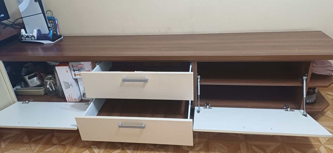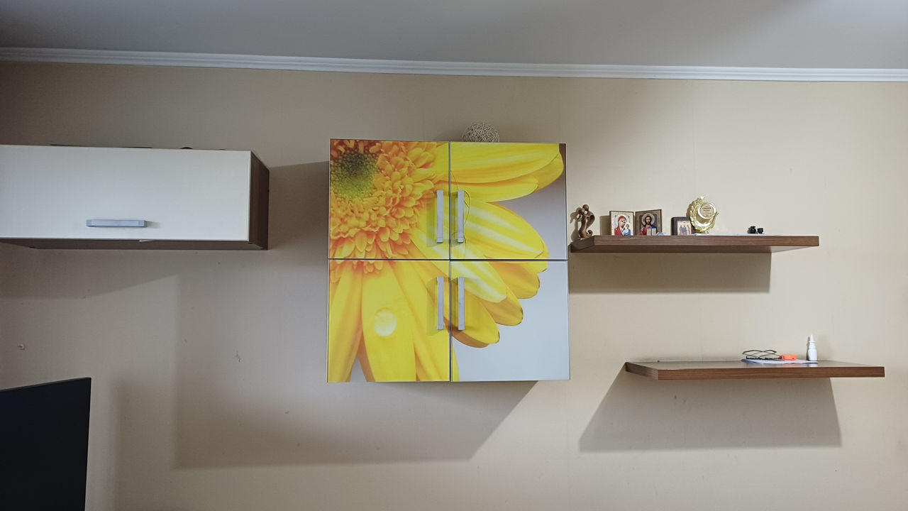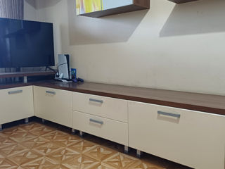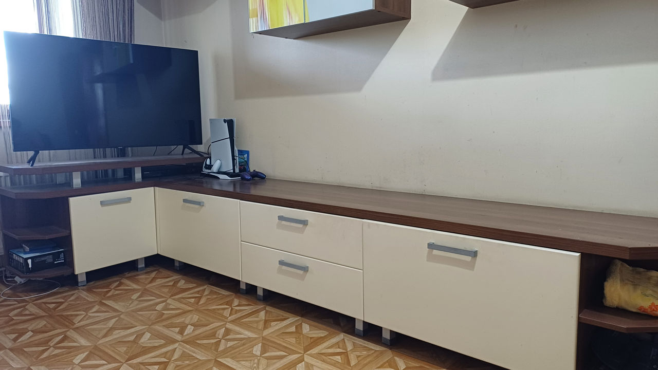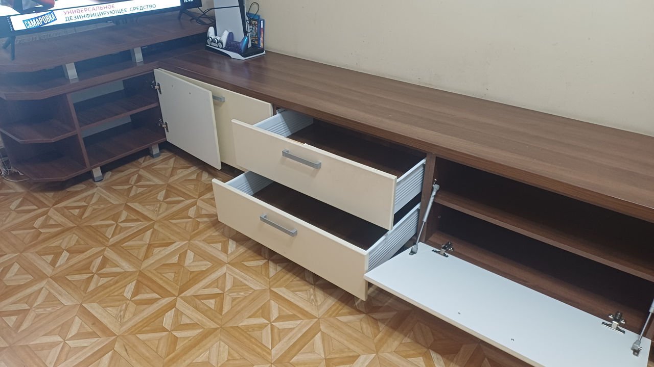 Модульная мебель в зал: -Воздушные полки -навесной шкаф-бар -навесной шкаф для хранения -угловая напольная конструкция с шкафами для хранения и местом под ТВ -журнальный столик