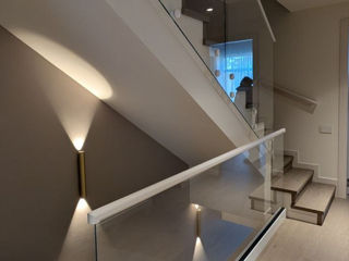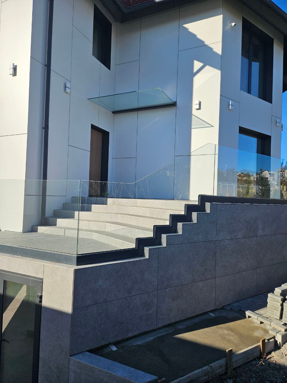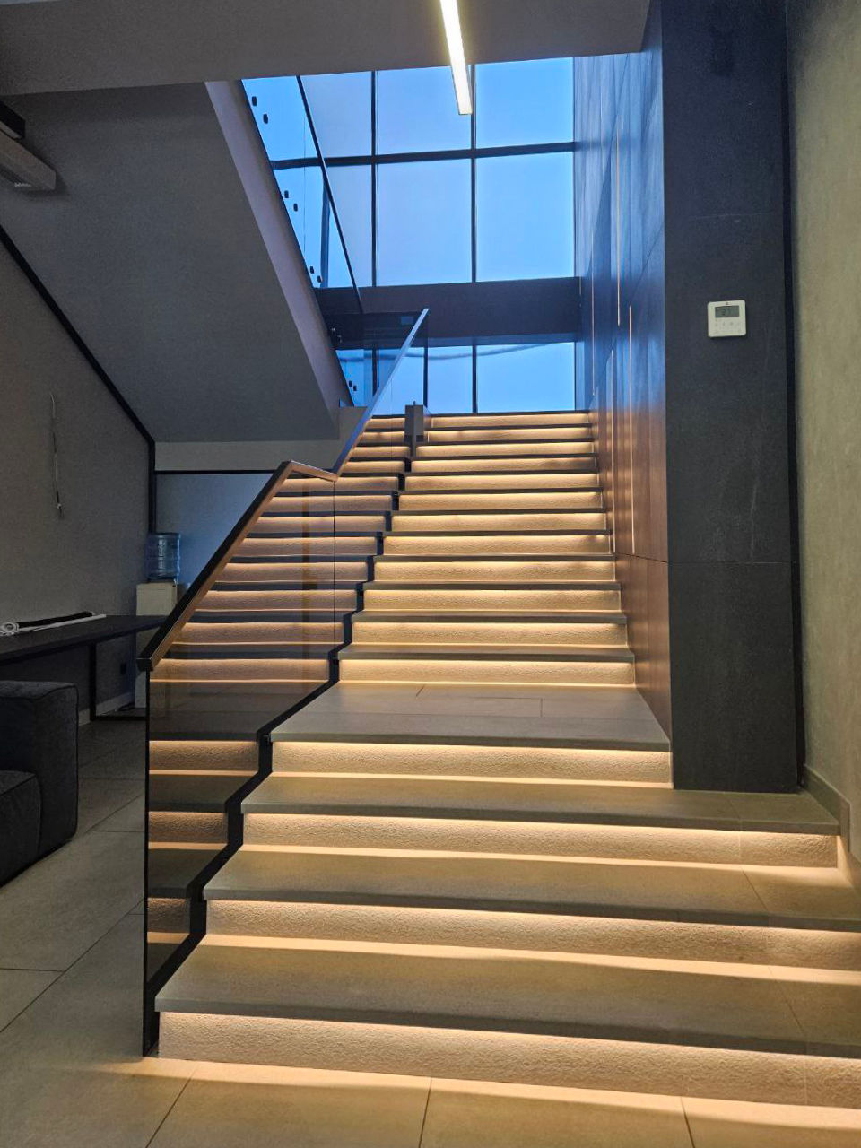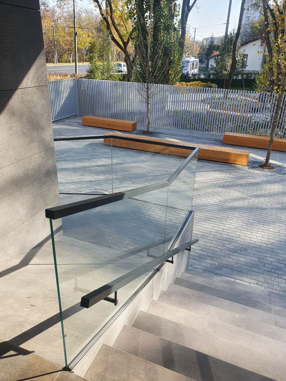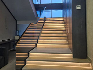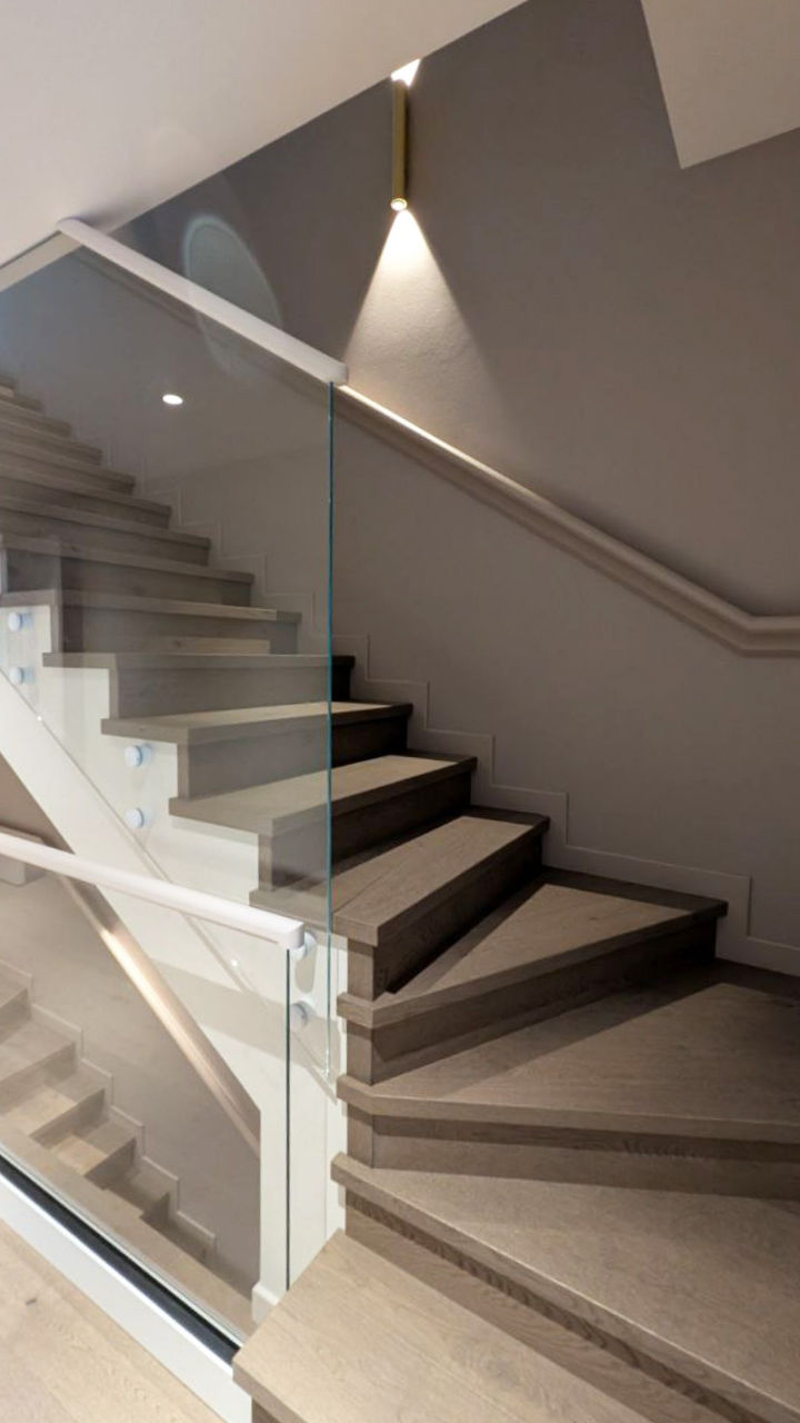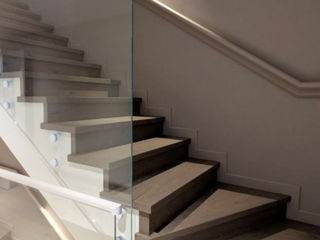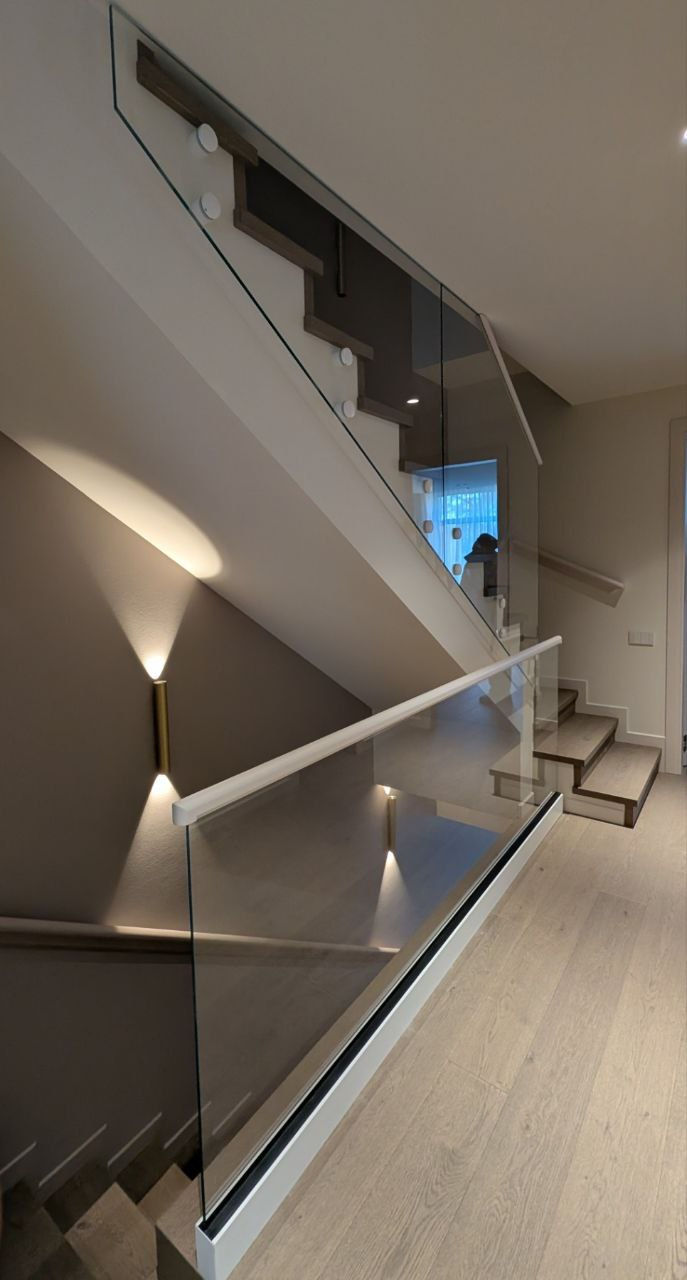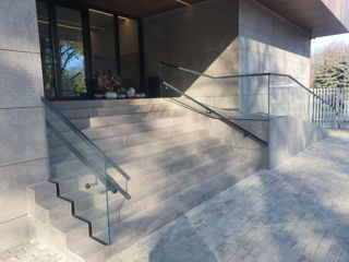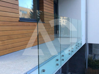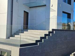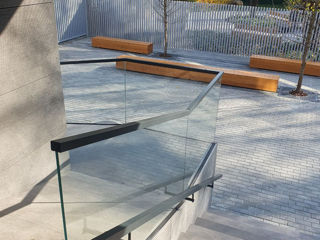 Scări realizate din sticlă securizată cu grosimea de 10–12 mm sau sticlă laminată (triplex), montate pe prinderi punctuale sau în profil metalic.
