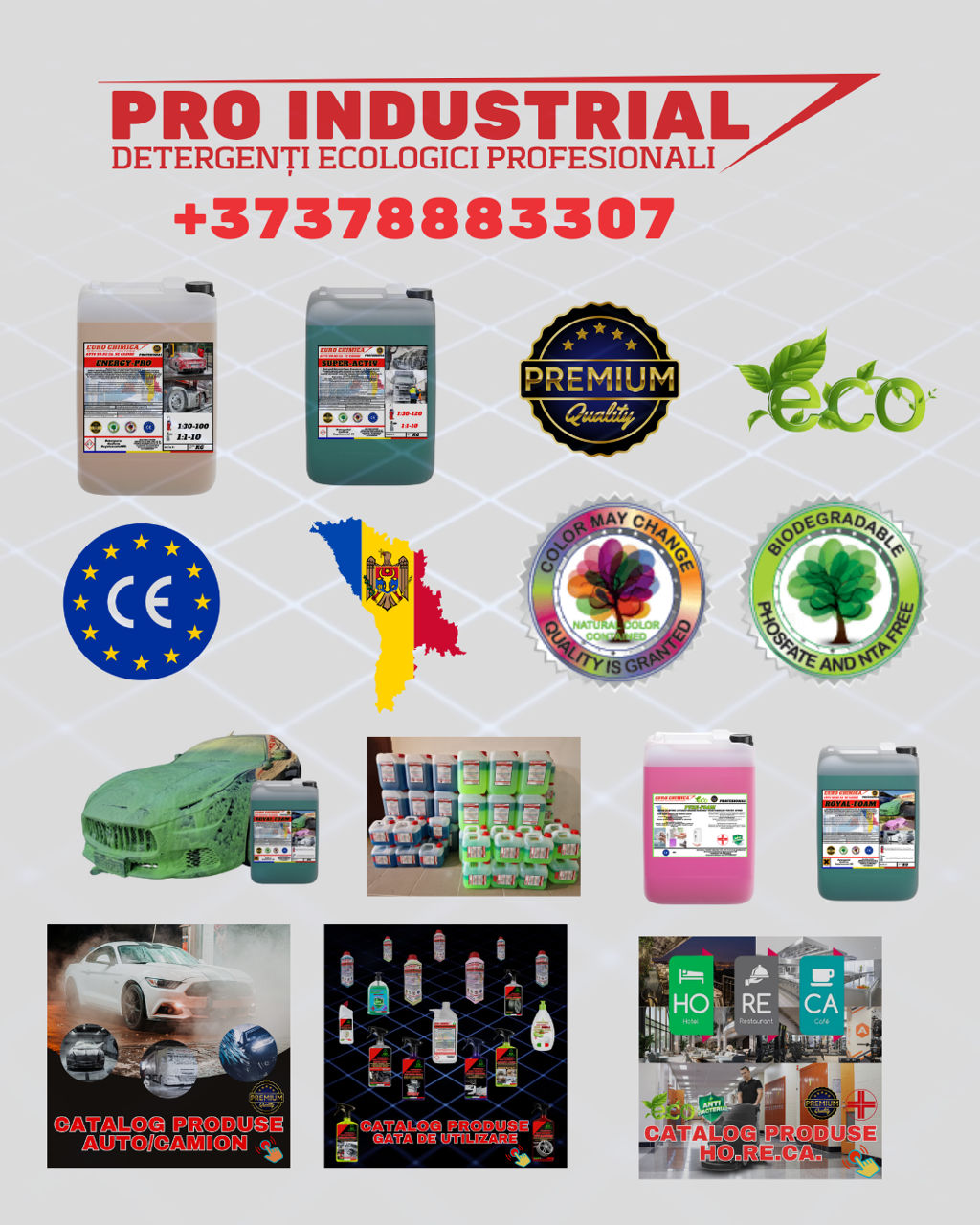 Detergenții profesionali spalatorie auto/camion/tir Автохимия www.proindustrial.md suntem o înterprindere specializată în producerea, detergenților chimici,profesionali ecologici sub marcă proprie de înaltă calitate destinate pentru spalarea AUTO HO.RE.CA. UZ CASNIC Modalități de plată Card (la livrare) Numerar (la livrare) Transfer (Plată cu card bancar online) Livrarea comenzilor în suma de la 500 lei în raza Chișinăului este gratis. La comanda pînă la suma 500 lei este contra cost - 50 lel. Livrarea comenzilor în suma de la 1000 lei în Moldova este gratis. Info@proindustrial.md 078883307 www.proindustrial.md