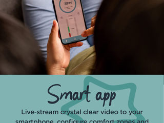 Aplicație inteligentă: transmiteți în direct videoclipuri și sunet de culoare cristalină din camera bebelușului direct pe smartphone-ul sau tableta i-OS sau Android, configurați-vă zonele de confort și urmăriți tiparele de somn ale bebelușului