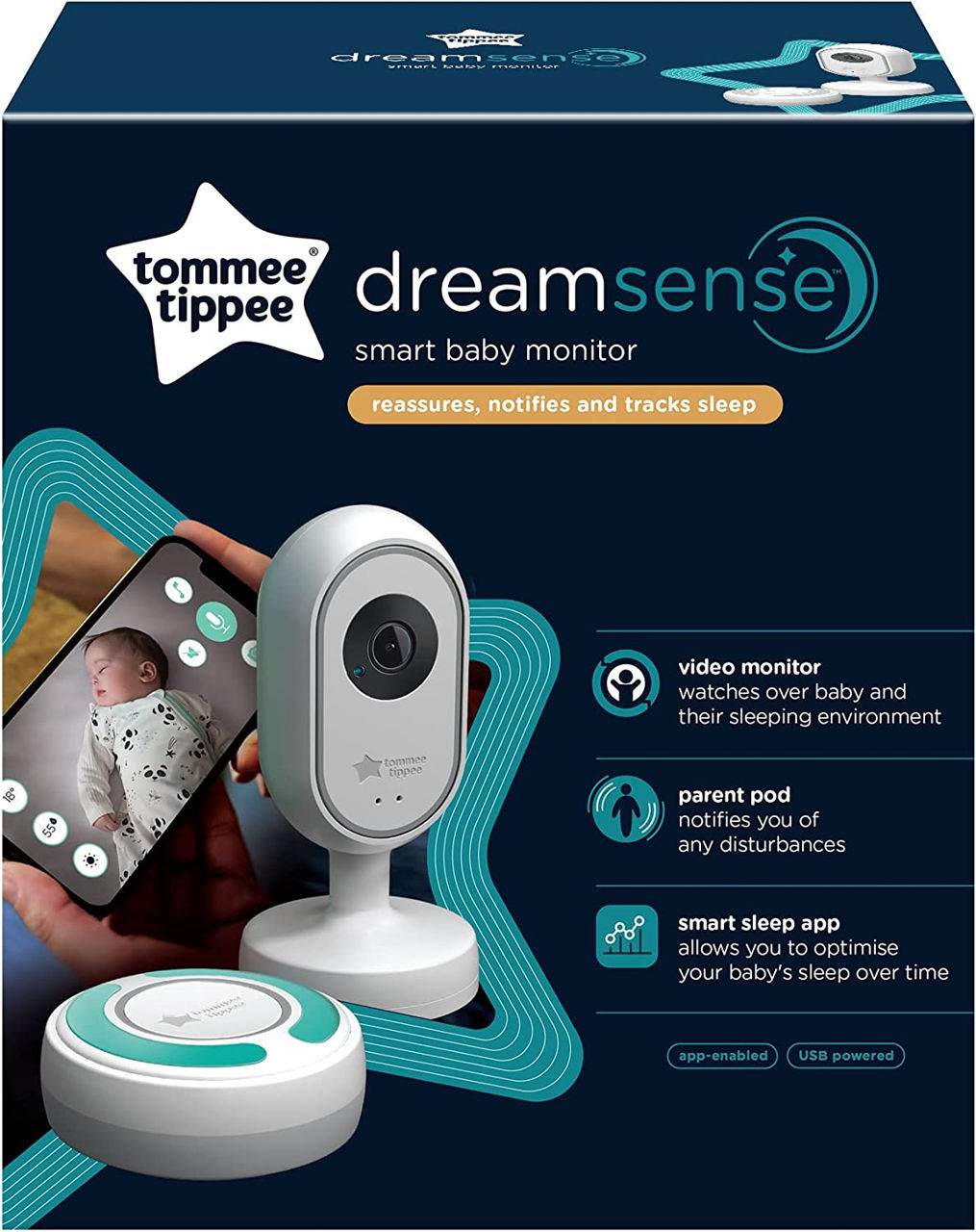 Tommee Tippee Dreamsense Monitor inteligent pentru bebeluși activat pentru aplicație, Cameră HD pentru înclinare și panoramă de la distanță cu vedere nocturnă, Audio bidirecțional, Pod inteligent pentru părinți pentru alerte personalizabile și urmărire a somnului