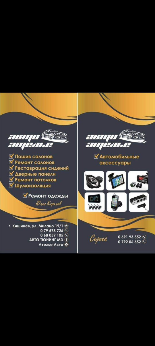 Ремонт- пошив сидений и реставрация салонов Ремонт офисных стульев . Ремонт потолков ..Шумоизоляция.Виброизолiяция. Установка подогрев сидении. Авто звук. Сигнализации .Камеры заднего вида. Регистраторы. Качественно .Быстро .Не дорого. Reparația-cusutul huselor pentru scaune și restaurarea salonului. Reparațtia plafoanelor. Climatizatoare. Instalarea sistemului de încălzire a scaunelor. Montajul izolării zgomotelor, sistemului de alarmă, camerelor de centrovizoare, registratoare. Calitativ, rapid, ieftin.