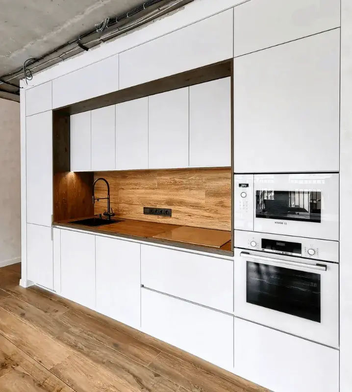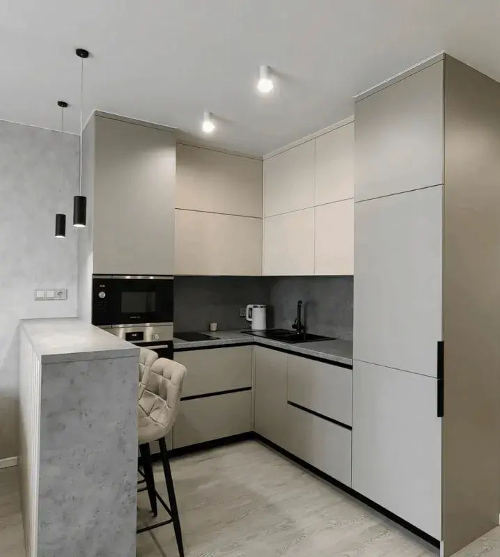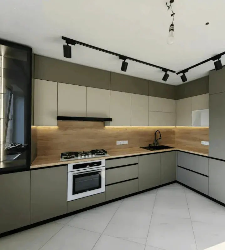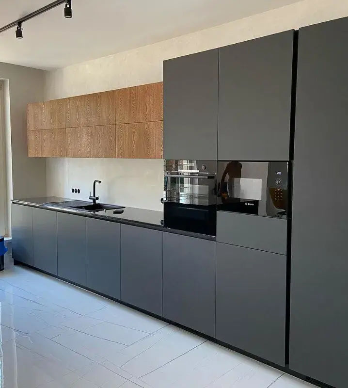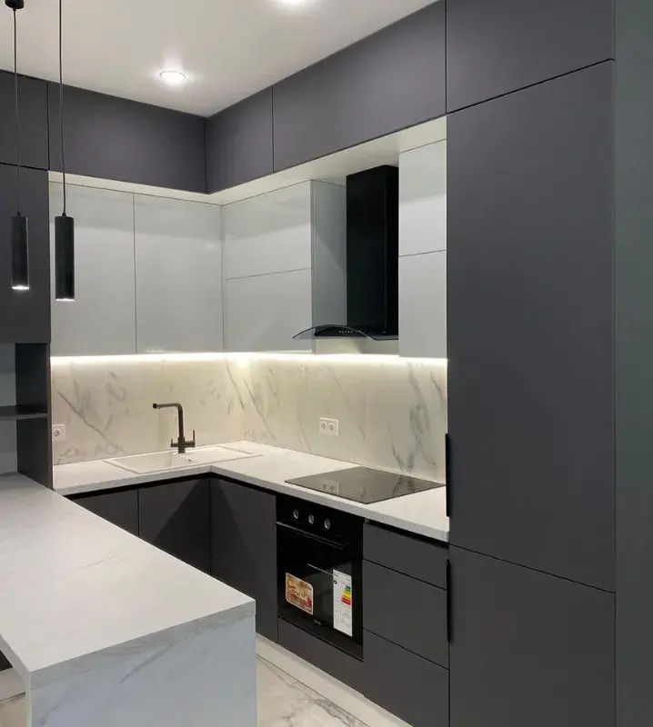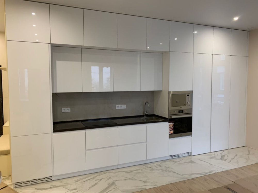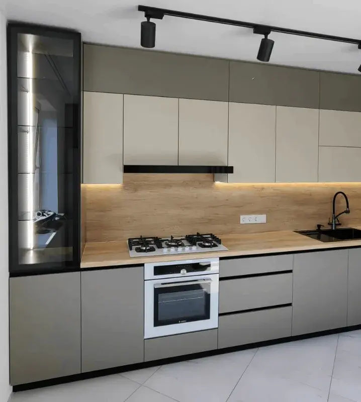 Итоговая цена зависит от типа фасадов, высоты кухни, наличия пеналов под котлы и др., а также от комплектации и производителя фурнитуры
