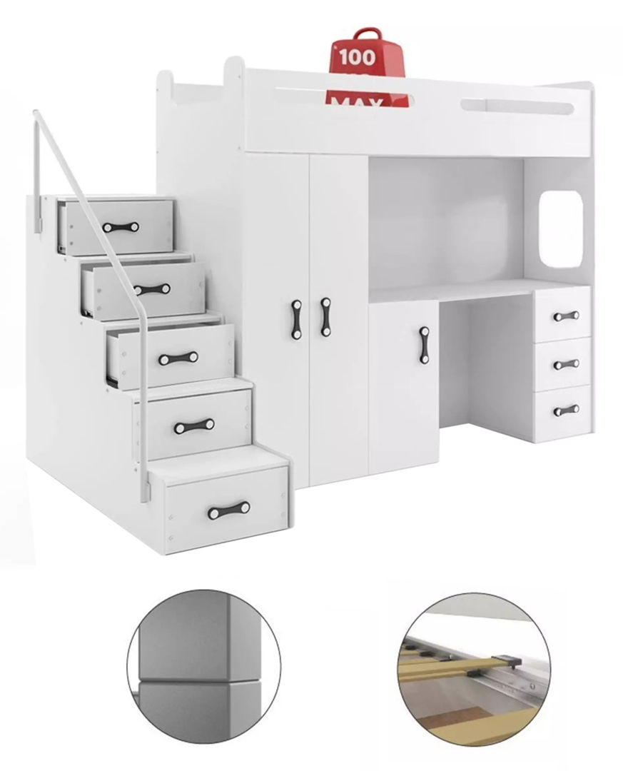 Mobila pentru copii MAX 4 este o soluție excelentă pentru toți cei care apreciază funcționalitatea, designul modern, precizia și calitatea manopera. Construcția stabilă garantează siguranță și confort pentru copilul dumneavoastră. Întreaga structură a patului este realizată din plăci MDF de înaltă calitate, în timp ce plăcile vopsite sunt din PAL.